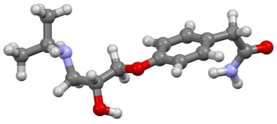It has been demonstrated through NMR spectroscopy that some beta-blockers like Atenolol (Ate) (Figure 2) can form 1:1 host–guest complexes with CB[7]. The CB[7] molecule has an outer diameter of around 16 Å, while the inner cavity diameter is approximatively 7.3 Å [53]. Due to these dimensions, Ate can bind over the central phenyl ring, which can be fully incorporated into the hydrophobic cavity of CB[7] [54].