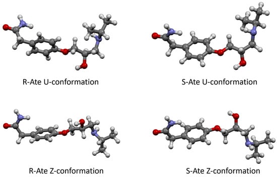 According to quantum chemistry calculations, Ate enantiomers present two geometrically distinct types of conformations when they are alone and not complexed with other molecules, namely Z-type and U-type. The chemical structure and the optimized geometries of Z and U conformations were calculated using the wB97XD method at 6-311+G(d,p) level of theory and are presented in Figure 3. Of these, the most stable one was determined to be Z-type for both enantiomers (Table 1).