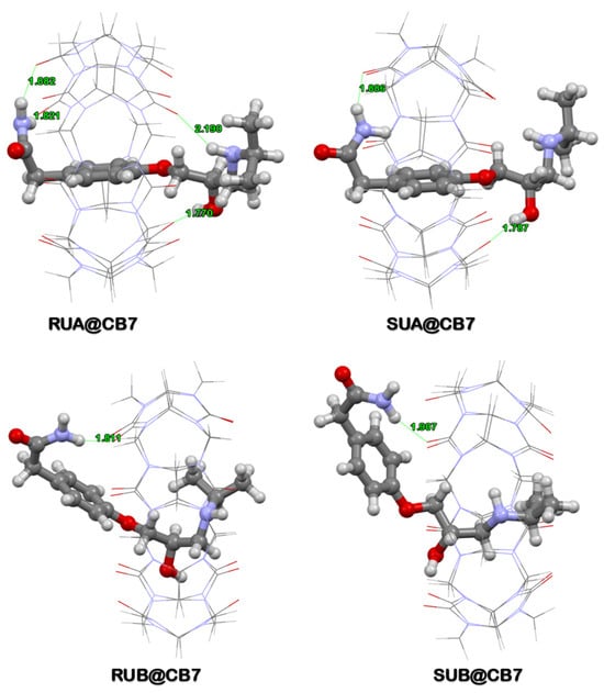 One can observe that in the case of A-type conformation, the phenyl ring of Ate is positioned in the middle of the CB[7] cavity, while in the case of B-type conformation, the Ate phenyl ring stands outside the CB[7] cavity. In addition, the A forms of the U-type complexes are the ones that present the best integration of Ate into the CB[7] cavity with similar complexation energies (−35.03 kcal/mole for R-Ate, −36.62 kcal/mole for S-Ate). Moreover, as observed in Figure 4, four H-bonds are formed for the RUA@CB[7] complex, two of them being realized through the amino group and two through the OH and NH groups. Instead, for the SUA@CB[7] complex, only two H bonds are formed, one through the amino group and one through the hydroxyl group. This fact can explain the increased stabilities of the R-Ate enantiomers.