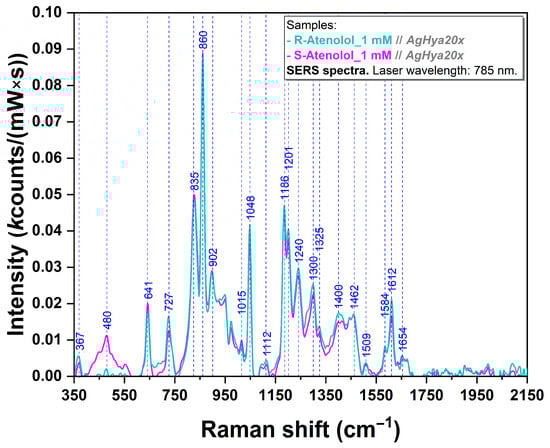 The SERS spectra of pure R/S-Ate were recorded using the same experimental conditions. As expected, the spectra are almost identical (Figure 5), being dominated by the following vibrational bands: 641, 727, 835, 860, 1048, 1186, 1201, and 1612 cm−1.