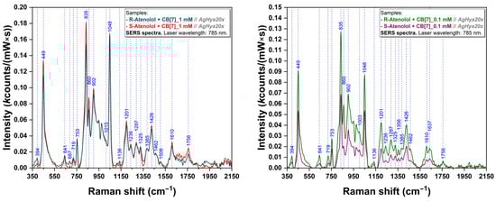 Then, the formation of the complexes between CB[7] macrocycles and Ate enantiomers was investigated by SERS. In the case of complexes formed between CB[7] and R-Ate (R-Ate@CB[7]), respectively S-Ate (S-Ate@CB[7]) we have recorded spectra at two concentrations: 1 mM and 0.1 mM respectively. For both concentrations and types of complexes the bands located at 449, 835, and 1048 cm−1 stand out as being the most intense ones (Figure 6). For a solution concentration of 1 mM, minor intensity differences can be noticed in the case of S-Ate@CB[7] as compared to R-Ate@CB[7] (Figure 6 (left)). On the other hand, the results are very different for 0.1 mM concentrations (Figure 6 (right)), where noticeable amplification can be observed regarding the spectrum of R-Ate@CB[7] complex with respect to S-Ate@CB[7]. These results suggest that the CB[7] molecule could be explored for chiral sensing potential via SERS using host–guest complexes. In a previous study we used quite a similar approach to discriminate Propranolol enantiomers by means of SERS using cyclodextrins as host molecules [60].