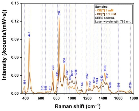 The SERS spectra of pure CB[7] molecules at two solution concentrations (1 and 0.1 mM respectively) are presented in Figure 7. Very surprisingly, since we analyzed a molecule with quite a good affinity for the metallic substrate, the spectra recorded for analyte concentrations of 0.1 and 1 mM, respectively, are quite different with respect to vibrational band intensities and ratios. The spectra are dominated by several bands (445, 753, 834, 900, 1192, and 1424 cm−1).