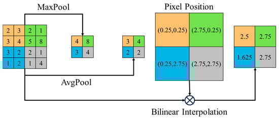 Most downsampling methods in the encoder–decoder framework of U-shaped models rely on pooling operations, with MaxPool and AveragePool being the most commonly used. However, MaxPool disregards the influence of the remaining N2-1 values, limiting the model’s full utilization of feature layer information, while AvgPool fails to differentiate the weights of the values. In contrast, bilinear interpolation is a method of interpolating an image on a two-dimensional plane. It estimates the value of a target point by weighted averaging the four nearest points, which form a rectangular region within which the target point is located. This approach fully considers both the values of the points in the region and the weights of each point. Therefore, in the downsampling stage of the FCUNet encoder, we introduce bilinear interpolation to enhance feature extraction accuracy while preserving spatial information. Additionally, this technique smooths the image, reducing the appearance of jagged edges, and adapts well to different feature scales. Figure 2 illustrates the operational processes and outcomes of these three downsampling methods, where “pixel position” denotes the position of the postsampling point before sampling.