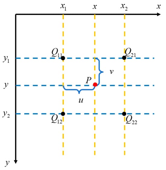 For each pixel point after downsampling, we consider its four nearest neighbors surrounding its corresponding position in the original image. These four points form a rectangular region, with the target point located inside this rectangle. First, we apply linear interpolation along the horizontal direction, followed by linear interpolation in the vertical direction, yielding the final interpolated result. The calculation process is illustrated in Figure 3, which visualizes the positional relationship between the target point and the four surrounding points. The mathematical expression for this process is provided in Equation (1).
