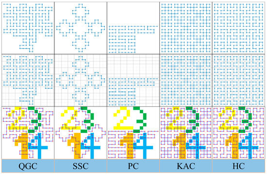 In the encoder, we introduce a fractal curve-based module to traverse multi-dimensional feature maps at various scales. Fractal curves of different orders can efficiently traverse feature maps of different resolutions. The appropriate order of the fractal curve is selected based on the input image size, balancing computational complexity with traversal accuracy. This process can be understood as mapping a two-dimensional image into a one-dimensional space while preserving the spatial relationships between pixels. The resulting one-dimensional pixel sequence contains all the information of the original image, and the sequence is then reconstructed back into the original two-dimensional form—this process is referred to as “straightening and reconstruction”. By considering both the original image dimensions and the properties of the fractal curves, each element in the sequence can be returned to its original position via inverse mapping, resulting in interesting transformation effects. This study focuses on five common fractal curves and their application to pixel traversal: the Quadratic Gosper Curve (QGC), Square Sierpinski Curve [36] (SSC), Peano Curve [37] (PC), Krishna Anklets Curve (KAC), and Hilbert curve [38] (HC). Figure 4 provides a schematic of how these five curves traverse pixels in a digital image.