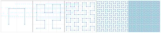 Fractal curve traversal paths can be generated using the L-system [39] method. In this thesis, we provide the pseudo-code for generating Hilbert curves based on the L-system, as detailed in Table 2. Additionally, we illustrate the recursive transformation of Hilbert curves from order 1 to 5, as drawn by the L-system. Figure 5 presents a series of images visualizing the structural characteristics and increasing complexity of Hilbert curves across different orders.