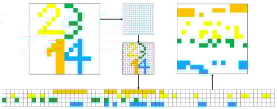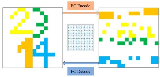 The pixel wandering paths generated by the Hilbert curve of order are tailored for image slices with dimensions . For our experiments, we chose . Algorithm 1 outlines the steps involved in this process. To demonstrate the impact of a fractal curve on an image slice, we present the effect of a Hilbert curve of order 4 applied to a 16 × 16 square slice. The pixel chain generated after traversal is then reconstructed back to the original image size, and the comparison before and after the Hilbert curve is applied to the digital template is shown in Figure 6. Additionally, the FC Encode and FC Decode modules in FCNet represent a pair of inverse operations, as illustrated in Figure 7.