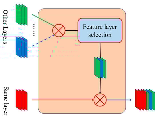 Firstly, the multi-dimensional feature map outputs from other layers that are not in the same layer are aggregated, and the dimension N of the same layer feature values is obtained. Then, the L1 normal form value of a single feature map is calculated, and multiple normal form values are sorted from large to small. The top N values corresponding to the feature maps are selected and combined with the multi-dimensional feature maps in the same layer to form a 2N dimensional feature map as input for other modules. The advantage of this method is that it maximizes the utilization of feature information by selectively fusing layers. By using L1 regularization, it ensures the selection of representative feature layers, reduces computational complexity, and minimizes the number of training parameters in the decoder, contributing to a more lightweight model.