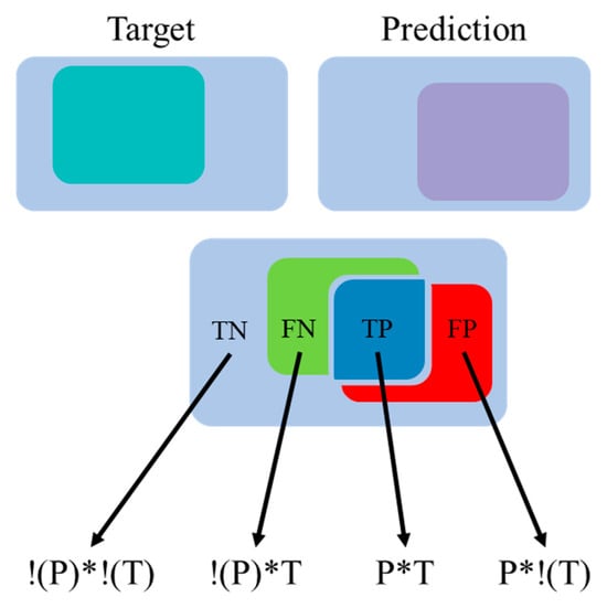 The evaluation of semantic segmentation models relies on the computation of a confusion matrix. In binary classification, the confusion matrix includes four parameters: True Positive (TP), false negative (FN), False Positive (FP), and True Negative (TN), as outlined in Table 3. Since semantic segmentation operates at the pixel level, these parameters are computed based on the intersection and union of the target and prediction results. The specific region division and calculation methods are illustrated in Figure 9.