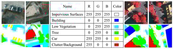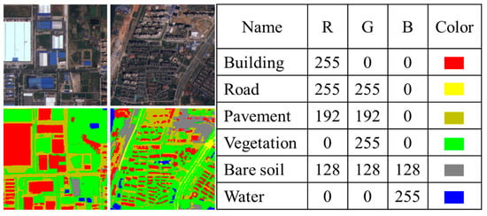 The dataset categorizes features into six classes: buildings, roads, sidewalks, vegetation, bare soil, and water bodies. This classification encompasses the major feature types found in urban environments, providing a comprehensive sample for urban remote sensing studies. Since the dimensions of the original and masked images meet the requirements of our study, they can be used directly without additional preprocessing steps. Figure 10 displays examples of the images and masks from the dataset, along with the corresponding RGB color table for each category. This visualization not only intuitively illustrates the dataset’s content but also serves as a clear reference for subsequent analysis and processing.