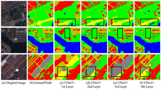 To identify the optimal insertion points for FCEncode and FCDecode, we conducted experiments using the UNet3+ model and the WHDLD dataset. The experimental results are presented in Figure 12: column a displays the original resolution remote sensing images, column b shows the corresponding ground truth images, and columns c-f illustrate the segmentation effects when FCEncode and FCDecode are inserted into the 1st to 4th layers of UNet3+, respectively.