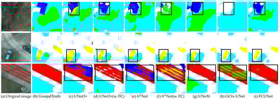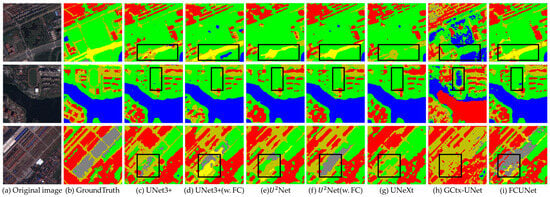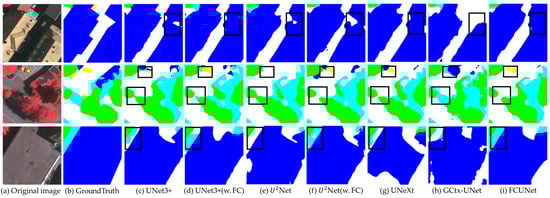 Figure 16 presents the segmentation results for Vaihingen. In the second row of columns (c) and (e), the green areas representing trees exhibit boundary adhesion, which is reduced in columns (d) and (f) with the fractal curve module. Moreover, in the third row, the model with the fractal curve module lowers the probability of misclassifying low vegetation as impervious surfaces. Similarly, FCUNet’s segmentation results surpass those of the other four original models, showing fewer false negatives for buildings (represented in blue) and a lower false detection rate for low vegetation.