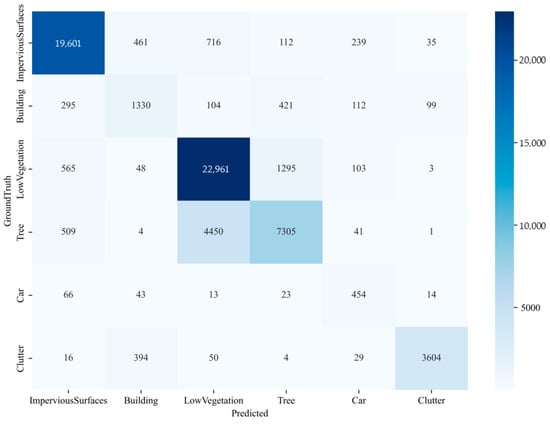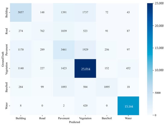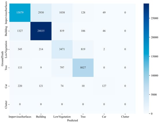 The confusion matrix for Potsdam (Figure 17) reveals that pixel classification for impervious surfaces, low vegetation, and clutter is relatively strong, while buildings and trees demonstrate poorer classification performance. In the confusion matrix for Vaihingen (Figure 18), pixel classification for impervious surfaces, buildings, low vegetation, and trees is good, whereas cars and clutter exhibit weaker classification performance.