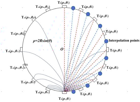 However, the ill-posed solution nature of ET measurements reduces the imaging quality of the above methods. To obtain more measurements and ensure that these measurements closely approximate the actual values, the RKBI algorithm has been proposed. This algorithm provides the optimal interpolation approximation for any measurement distribution function u(x) on the boundary ∂Ω of the ERT sensitive field Ω, with the approximation error being estimated. The principle is as follows: As shown in Figure 2, establish a polar coordinate system with electrode T1 as the origin to represent the 16-electrode ERT system. Apply excitation to electrode T1 and obtain 15 measurements u1, u2, …, u15 from the other electrodes. These 15 measurement electrodes correspond to polar coordinates (ρj, θj) in the polar coordinate system, where j = 1, 2,…, 15. According to Maxwell’s theory, the boundary measurements u are functions of θ and can be expressed as u = F(θ), with θ ∈ [0, 2π]. Since there are no actual electrodes at the interpolation points on the boundary, the measurement values cannot be directly obtained. To obtain the values of these interpolation points, it is necessary to use u = F(θ) and substitute the positions of these interpolation points expressed in terms of θ into the relationship to solve for u.