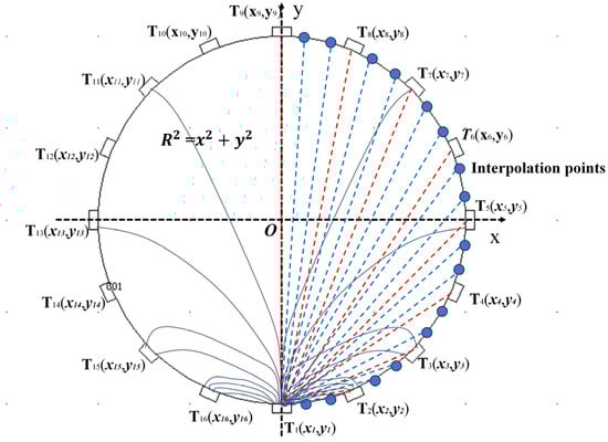 For a 16-electrode ERT system, consider exciting electrode T1 and obtaining 15 measurement values from the other electrodes. Let the origin of the Cartesian coordinate system be defined at the origin, with the 16 measurement electrodes corresponding to the Cartesian coordinates Mi = (xi, yi), where i = 1, 2,…, 16. The standard equation of a circle in Cartesian coordinates is given by: