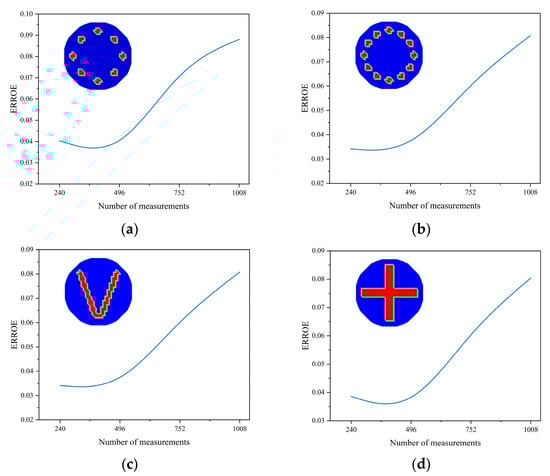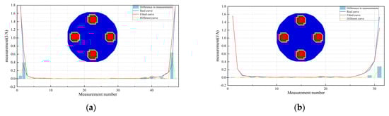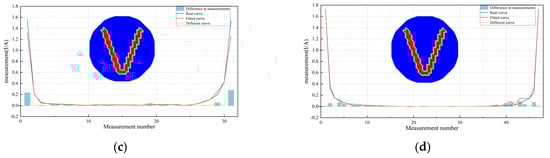 To validate the optimality of the interpolation method, four comparative experiments were conducted using COMSOL 3.5a software. Compare the interpolation curve obtained using Equation (47) with the actual curve. For clarity, the numerical values obtained from interpolation are referred to as numerical measurements. Taking Figure 4b as an example, the conductivity of the measured object (four small circles) and the background were set to 1 × 10−5 and 1 μS/cm, respectively. A single excitation–single measurement 16-electrode ERT system was used for testing. One electrode was arbitrarily selected for excitation, and the remaining 15 electrodes provided 15 measurement values. Using these 15 measurements, interpolation was performed based on Equation (47), ensuring that interpolation points were uniformly distributed across the entire boundary of the sensitive field and also evenly distributed between two electrodes. This resulted in n numerical measurements. By iterating over all 16 electrodes, a total of 16n numerical measurements and 240 actual measurements were obtained, resulting in a total of 240 + 16n measurements. For this group, n = 16, the number of measurements in one set is 31 (represented by the red curve in Figure 4a). For comparison, by inserting m electrodes between each of the original 16 electrodes in the model constructed in COMSOL, a total of 240 + 256m actual measurements can be obtained. When m = 1, the number of measurements in one set is also 31 (represented by the blue curve in Figure 4a). When n = 32 and m = 2, the number of measurements per set was 47. The comparison results are shown in Figure 4b. The measured object was of a “V” shape, and repeating the above steps resulted in the results shown in Figure 4c,d.