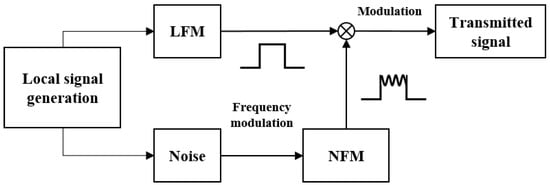 To enhance the complexity and randomness of the signal, this paper proposes a novel radar signal waveform constructed based on noise. The specific block diagram for generating the novel radar system’s transmitted signal is shown in Figure 2. Initially, a wideband LFM signal and a random noise signal are generated locally. A narrowband NFM signal is then produced based on the random noise signal. The local radar system combines the narrowband NFM signal with the wideband LFM signal through amplitude modulation, forming a composite signal. This composite signal is used as the transmitted signal for the radar system.