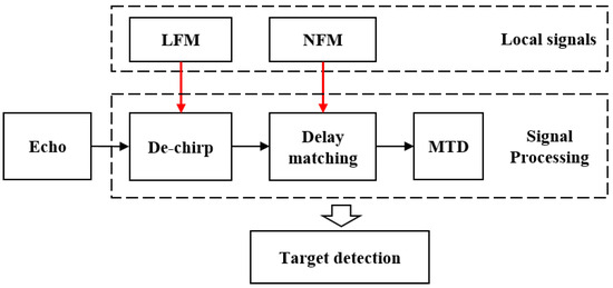 To efficiently process the detection echoes of the novel radar system’s composite waveform, a signal processing method based on de-chirp and delay matching is employed. The signal processing block diagram is shown in Figure 3. After performing de-chirp and delay matching with the radar system’s local signals [6,26], target detection is carried out using MTD.