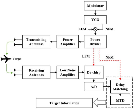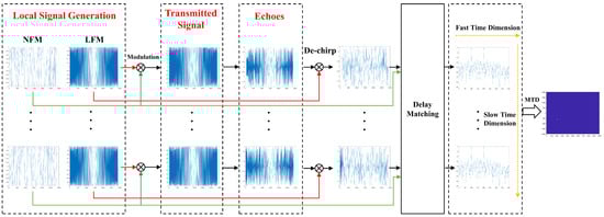 The visualized block diagram of the signal processing method is shown in Figure 4. In the fast time domain, our radar system first uses the transmitted LFM signal carrier as the reference signal to de-chirp the received echo, resulting in a narrowband NFM signal after removing the wideband LFM component. Consequently, subsequent signal processing requires a lower sampling rate. The system then performs delay matching between the transmitted NFM signal and the de-chirped echo, replacing the conventional matched filtering process. By analyzing the point frequency signal obtained from the matching process and considering the slope of the LFM signal, the time delay of the target echo is determined. Finally, in the slow time domain, MTD is conducted to acquire the target information.