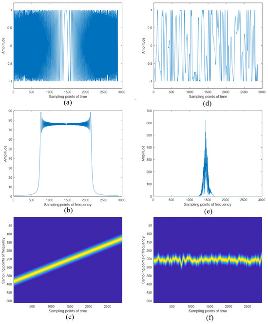 The LFM and NFM signals generated locally by the radar system. (a) The time domain waveform of LFM; (b) the frequency domain waveform of LFM; (c) the time–frequency domain waveform of LFM; (d) the time domain waveform of NFM; (e) the frequency domain waveform of NFM; (f) the time–frequency domain waveform of NFM.