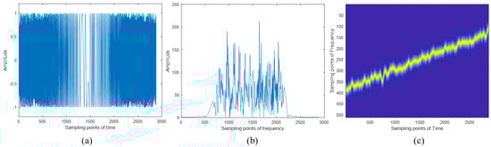 The transmitted signal of the radar system. (a) The time domain waveform of the transmitted signal; (b) the frequency domain waveform of the transmitted signal; (c) the time–frequency domain waveform of the transmitted signal.
