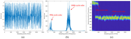 The echo signal after de-chirp. (a) The time domain waveform of the de-chirped signal; (b) the frequency domain waveform of the de-chirped signal; (c) the time–frequency domain waveform of the de-chirped signal.