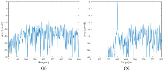 During the delay matching process, the result value corresponding to the delay sampling point index of each delay match is used as the value for the corresponding sampling point index in the overall matching result. Consequently, the matching result obtained after the entire delay matching process will exhibit a maximum peak at . Since the parameter K is known, we can convert this frequency domain matching result into an equivalent matched filtering result, thus obtaining the target’s delay and subsequently calculating the target’s distance. Additionally, as the Doppler component remains in the constant term within the frequency domain result, we can obtain the target’s velocity information to detect the target by further processing through slow time accumulation and MTD.