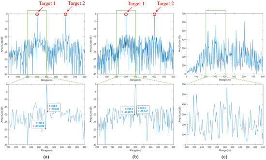 For a single cycle, the value corresponding to the delay index sampling point in the frequency domain result of each traversal is taken as the value of the corresponding sampling point in the matching result for that cycle. The fast time processing results of the 100th cycle’s echo are shown in Figure 11. Figure 11a shows the range domain result obtained by delay-matching between the local NFM signal and the de-chirped echo. Figure 11b presents the range domain detection result obtained by the proposed composite transmitted signal directly matched with the echo signal. The results of the traditional method, which uses de-chirp and frequency domain processing as a substitute for matched filtering, are shown in Figure 11c. Evidently, this approach is not suitable for the radar system with the signal structure proposed in this paper, as it fails to detect the target. Both the delay matching result in Figure 11a and the matched filtering result in Figure 11b successfully obtained the range information of the two targets. According to the bandwidth of the local LFM signal set in the simulation parameters, the range resolution of the original signal can be calculated as 5 m. In our approach, using de-chirping delay-matching processing, although the required sampling rate is reduced by lowering the spectral bandwidth, the results shown in Figure 11a,b indicate that the main lobe width of the range domain matching result still maintains a range resolution level of 5 m. Therefore, the proposed processing method does not affect the system’s range resolution. Moreover, the main-to-side lobe ratio in the delay matching method’s result was −22.63 dB, while that of the matched filtering result was −22.93 dB, showing only a minor difference. Thus, the proposed method retains the range resolution capability of the original signal and maintains a similar main-to-side lobe ratio even with the reduced sampling rate. In the simulation, the traditional matched filtering method requires a sampling rate of 120 MHz, whereas the proposed method achieves the same performance with only a 60 MHz sampling rate.