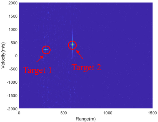 After obtaining the delay-matching result, MTD accumulation is performed over multiple processing cycles in the slow time dimension to achieve the targets’ range–Doppler map, as shown in Figure 12. It can be observed that both targets are successfully detected.