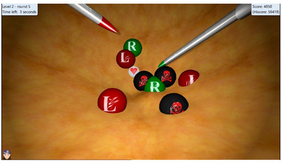 Screenshot of the LapSim task (precision and speed) for mental effort. The surgical instrument with a green tip (right) bursts the green balls (R), while the tool with a red tip (left) bursts the red balls (L). The skulls must not be hit, and the hearts bring extra points. In addition, there are blue balls, which must be touched with both tools at the same time to burst the ball.
