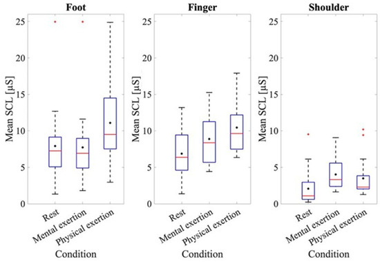 Mean SCL at rest and during physical and mental exertion for the different recording sites. The box plots show the 25th and 75th percentiles and the median in red, with the mean indicated in black.