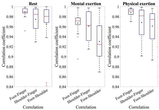The coefficients of the cross-correlation for the resting measurement, mental exertion, and physical exertion for the comparisons of foot–finger, shoulder–finger, and foot–shoulder.