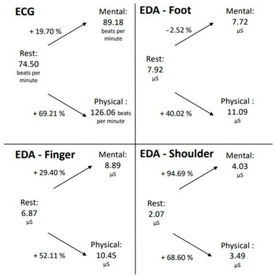 Changes in EDA and ECG data during mental and physical exertion compared to the resting measurements.