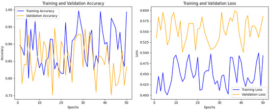 Figure 4 shows the training and validation accuracy and loss over 50 epochs, and both statistics show remarkable changes in the metrics displayed. The training accuracy’s range is around 90%. In contrast, the validation accuracy exhibits more fluctuation, which suggests overfitting since the model can score well in training data but not consistently in the evaluation data. The training loss remains constant and is always less than the validation loss, although the validation loss is always higher and more variable. Such differences mean that the model attempts to learn something only relevant to the training data. The results suggest that several changes may be necessary for optimal training processes, such as adding regularization or applying early stopping methods for training to validate performance improvement.