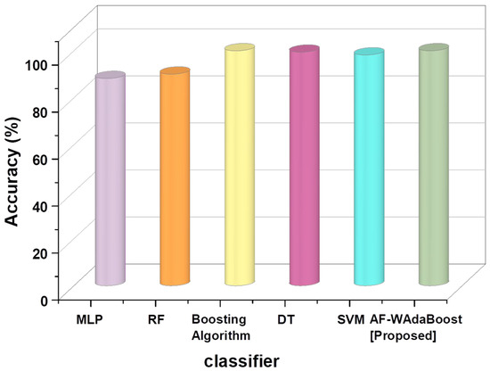 Figure 5 presents a visual comparison of the accuracy of the six models—the proposed AF-WAdaBoost model, MLP, RF, DT, SVM, and the Boosting Algorithm. The accuracies of the models in percentage values are presented on the y-axis, while the x-axis represents the different types of models employed. It can be seen that the accuracy of the AF-WAdaBoost and Boosting Algorithm are exceedingly close, nearly at 100%. On the other hand, MLP has the lowest score at slightly under 90% accuracy. The scores of MLP and RF are exceedingly close together, demonstrating that there is relatively little difference between the efficacy of these two models. Similarly, the close scores of the proposed model and the Boosting Algorithm shows that Boosting Algorithm may be an appropriate substitute in situations where the proposed model cannot be used.