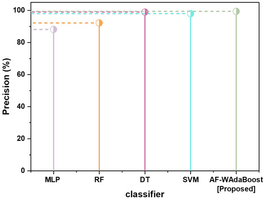 Figure 6 similarly presents a visual comparison of the precision of five models: MLP, RF, DT, SVM, and AF-WAdaBoost. The y-axis represents the precision as a percentage, while the classifier models are recorded on the x-axis. Once again, DT and AF-WAdaBoost score fairly closely, with SVM only slightly behind the two models. Meanwhile, RF and MLP lag significantly behind the other models in their precision.