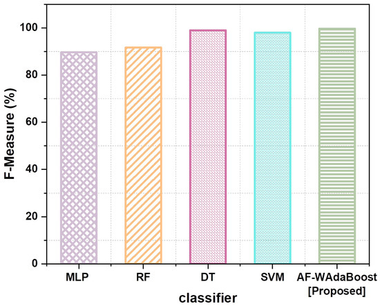 Figure 7 depicts a comparison of the F-measure for three classifiers. The compared algorithms are MLP, RF, DT, and SVM, and the proposed model is AF-WAdaBoost. The F-measure, which combines precision and recall into one metric, is presented on the right y-axis, and the classifiers are presented on the x-axis. The MLP (Multilayer Perceptron) classifier attains an F-measure of around 89.62%, SVM attains 98.0%, and DT achieves 99.0%. An improvement is observed with the RF classifier, which has an F-measure of approximately 91.71%. The AF-WAdaBoost classifier proposed in the study also excels beyond the proposed classifiers with a high F-measure of nearly 99.7% highlighted by a green star. Based on the results, it can be concluded that the suggested AF-WAdaBoost classifier is better for the detection of cyber threats in the IoT context. The F-measure has improved significantly, and this is an indication that both the precision and recall have improved, which is a sign that the classifier can detect threats more efficiently and accurately with minimal mistakes.