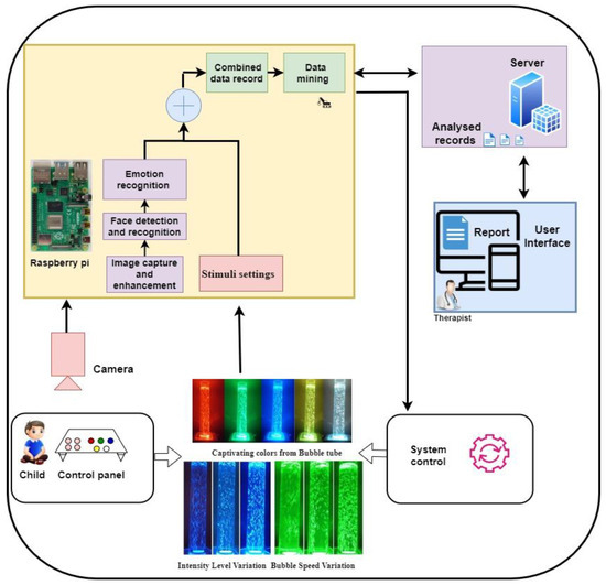 Required hardware and software modules are developed for recognizing and classifying children’s emotional responses to visual stimuli and mining the logged data records during child interaction with BT. The developed software modules are deployed to Raspberry Pi 4 (8GB RAM), which is a mini-computer capable of running deep learning models using Tensor Flow Version 2.9. The Logitech HD cam (Logitech, Delhi, India) is interfaced with Raspberry Pi4 to capture images of children during the interaction sessions.