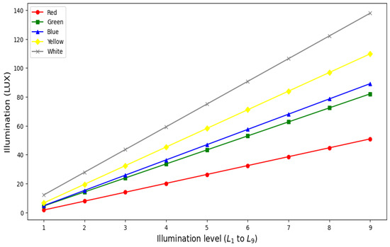 Illumination for different intensity levels measured using LUX meter.