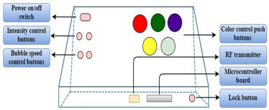 The CP is fabricated as per the design shown in Figure 4 for children to control visual stimuli generated by BT. CP consists of five illuminated push buttons for color selection, which allows participants to choose a variety of colors as per their interests. Additionally, four push buttons are provided, of which two are for controlling the intensity levels and the other two push buttons to regulate the bubble speed. The amusement arcade push buttons were used to provide ease of control and durability. The microcontroller unit is placed inside the panel to process the user input from the push buttons and to transmit the corresponding data to BT. The control panel establishes wireless communication using RF transmitter and receiver, allowing immediate adjustments of the sensory stimulating parameters. All the electronics are integrated within a wooden frame to ensure a robust and durable interface specifically designed for children. The choice of a wooden frame was made considering the sturdiness and capacity to withstand repeated interaction and manipulation by children and also ensuring its durability and consistency throughout sessions.