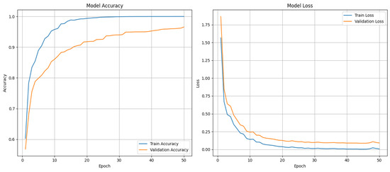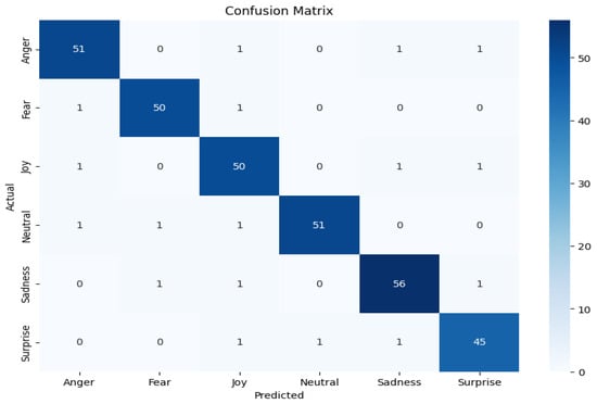 This work uses a combined dataset, which is prepared by adding custom-made dataset of autistic children with openly available autistic children’s emotions dataset from kaggle. The dataset from kaggle includes 758 images divided into 6 classes: anger (67 images), fear (30 images), joy (350 images), neutrality (48 images), sadness (200 images), and surprise (63 images). This dataset was combined with the custom-made data of autistic children coming to autism center to equalize the 6 emotion classes. This enhancement was completed to achieve better accuracy by providing a more balanced and extensive collection of images for training across all the classes. The six primary emotions used are shown in Figure 5. These emotions, such as anger, fear, joy, neutrality, sadness, and surprise, were selected based on established psychological theories of emotion and their relevance in assessing emotional responses in children with ASD. Each emotion is shown with corresponding facial expressions to aid in understanding how they manifest visually. The generated new dataset comprises total of 2114 images divided into 6 classes: anger (355 images), fear (345 images), joy (350 images), neutrality (356 images), sadness (390 images), and surprise (318 images). Of the total set of images, 85% are used for training, and 15% of images are used for validation. This combined dataset was used to train a facial emotion recognition model using Google’s Teachable Machine, which is a web-based tool that simplifies the process of creating deep learning models. Teachable Machine allows users to train models by providing a user interface for uploading datasets, defining categories, and training the model. A set of training experiments was conducted by adjusting key parameters such as batch size, learning rate, and epochs to optimize the performance of the neural network. Through these experiments, it was observed that a learning rate of 0.001, 50 epochs, and a batch size of 32 generated the best performance model with training accuracy of 99.86% and validation accuracy of 94.69%. The performance of the trained model for 50 epochs is shown in Figure 6. The confusion matrix showing the correct and wrong predictions for each class is shown in Figure 7. The trained model was then evaluated using the testing set by uploading images to the interface to ensure its accuracy and reliability in recognizing the six defined emotions and that all the emotions are recognized correctly.