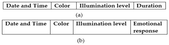 Each child’s interactions with BT in CCM and SCM modes were recorded by Raspberry Pi, and two primary datasets, one with CCM records and other with SCM records, were generated. The structure of logged data records in CCM and SCM are shown in Figure 8a,b, and the description of attributes is given in Table 1. For understanding, the sample data records logged during CCM are shown in Table 2, which includes the selections made by the child, such as preferred colors and illumination levels with durations. These interactions are logged with specific attributes. The date and time attribute records the exact moment of the interaction. The color attribute is recorded using abbreviations, such as R for red, B for blue, G for green, Y for yellow, and W for white. The illumination level is categorized into two broad intensity ranges: LI (low illumination) for levels with generated illumination less than 100 lux and HI (high illumination) for levels that generate illumination greater than 100 lux. These levels represent the brightness of the sensory stimuli generated by BT. The duration of the interaction is recorded in seconds, indicating how many seconds of time the child chose particular stimuli. On the other hand, the SCM data records shown in Table 3 include the system-generated combinations of colors and illumination levels and corresponding emotional responses exhibited by the child. The emotional responses of joy, surprise, anger, fear, sadness, and neutrality are categorized into positive and negative groups. Positive responses include joy and surprise, where the child shows happiness or excitement. Negative responses include anger, where the child displays frustration or distress; fear, indicating anxiety or discomfort; sadness, where the child appears downcast or disinterested; and neutral, which, while sometimes neutral, is often treated as negative due to a lack of positive engagement. The emotional response to each stimulus is recorded as either P (positive) or N (negative), reflecting the child’s immediate reaction.