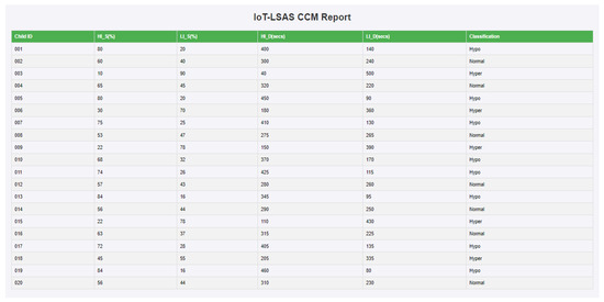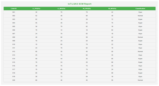 A 10-foot by 10-foot observation room was exclusively allotted to carry out the study where the IoT-VSIS setup is placed. The observation room has enough space to keep the bubble tube setup and allow participants to have a comfortable distance to access the sensory stimuli from the bubble tube. This specific room is primarily designed to avoid stray sounds and minimize external distractions, creating a quiet and focused environment for the work. Initially, a trial run of a few sessions was conducted with volunteers to understand the placement of BT and to find out safe interaction distance. After consultation with volunteers and the therapist about the bubble tube placement and interaction distance, the child was instructed to sit half a meter away from the BT to ensure a comfortable distance for observation. No further instructions were given to avoid distractions that influence the child’s responses and allow for natural engagement. The child’s interaction with BT in CCM is shown in Figure 9a, whereas the child’s interaction in SCM is shown in Figure 9b. Each participating child engaged in a total of six sessions (three CCM sessions and three SCM sessions) each session lasted for 180 s. In each mode, the interactions of the child are logged by Raspberry Pi. From the logged data records, in CCM, the preferred colors, illumination levels, and the respective duration of interactions are calculated, and the classification report is generated, which is shown in Figure 10. In the generated report, the first column represents the child ID (identification number assigned to the child), the second column represents the support for high illumination preference (HI_S(%)), the third column represents the support for low illumination preference (LI_S(%), the fourth column represents the total duration for which the child interacted with high illumination stimuli (HI_D(secs)), the fifth column represents the total duration for which the child interacted with low illumination stimuli (LI_D(secs), and the last column is the classification based on support and interacted duration. Similarly, the report generated for SCM mode is shown in Figure 11, where the first column represents the child ID, the second column represents the support value of positive emotional reactions for low illumination levels (LI_PRS (%)), the third column represents the support value of negative emotional responses for low illumination levels (LI_NRS(%)), the fourth and fifth columns represent the support values of positive and negative emotional responses for high illumination levels (HI_PRS(%), HI_NRS(%)), and the last column shows the classification report generated based on analysis of emotional responses exhibited for high and low illumination levels.