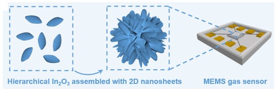 To prepare the MEMS gas sensors, as-obtained yellow powder was added to a mixture of ethanol and DI water to form a homogeneous paste. Next, the paste was evenly coated on the MEMS Micro-Hot-Plate (MHP). The MHP chip (INS-100) was purchased from Suzhou Xinmeixin Electronic Technology Co (Suzhou, China). The MHP chip size was 1.0 × 1.0 × 0.3 mm, equipped with a pair of heating electrodes and interdigital electrodes. The heating area was 0.3 × 0.3 mm. To form the stable sensing layer, the prepared MEMS sensors were dried in the oven at 60 °C for 6 h. In addition, the gas sensors were aged at 300 °C for 24 h before gas-sensing measurements. The schematic diagram of the formation of the hierarchical In2O3 and the MEMS sensor is shown in Figure 2.