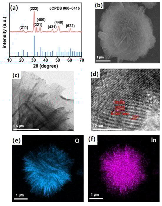 (a) XRD pattern; (b) SEM image; (c) TEM image; (d) HRTEM image; (e,f) EDS mapping images for O and In of In2O3.