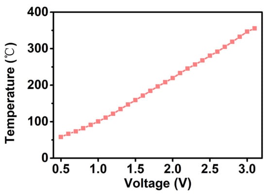 The temperature characteristics of sensitive materials on the MHP with the DC heating voltage were investigated because MOS sensing materials always need to work at a high temperature. The infrared emission coefficient of the MHP was set at 0.3, which was the same value used in the temperature measurement. Through the established measuring system, the surface temperature of the MHP after coating the materials was linear with the heating voltage, as shown in Figure 5.