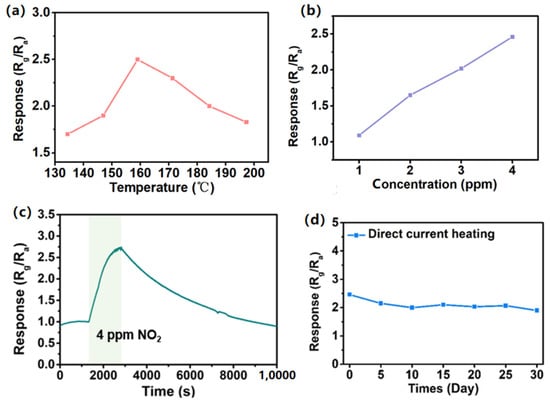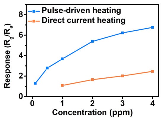 In addition, it is worth noting that the gas sensing characteristics were optimized in the pulse-driven heating mode compared with the DC heating mode. In the DC heating mode, continuous high operating temperatures inevitably promoted molecular desorption on the surface of the materials and reduced the concentration of surrounding target gas, as shown in Figure 10b [,]. In the pulse-driven heating mode, the low temperature stage reduced the desorption of the target gas []. As the temperature gradient disappeared, the gas concentration gradient drove the surrounding target gas to diffuse inside the sensing layer and conduct physical adsorption on the material’s surface to provide reactants for successive chemisorption and redox reaction in the next cycle’s Ton []. The above-mentioned process optimized the response and LOD of the sensors under the pulse-driven heating mode.