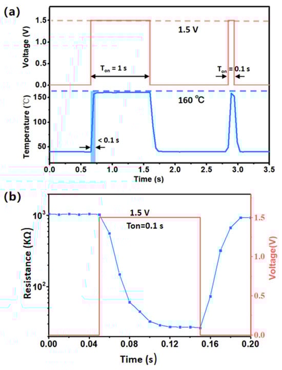 At first, one pulse-heating cycle voltage (Ton = 1 s, Twait = 1 s) was supplied to the MHP, and it can be seen from Figure 7a that the temperature quickly reached the optimum temperature 160 °C at Ton beginning and sharply decreased to normal temperature when Ton ended. The quick response time of temperature was about 0.1 s, so another pulse-heating cycle voltage (Ton = 0.1 s, Twait = 1 s) was applied to further investigate. The experiment shows the temperature could reach up to 160 °C in 0.1 s too. It was found that the accurate response time was less than 0.1 s and recovery time was about 0.1 s from the temperature response curve with the time axis extended. No further precise data can be given due to the sampling time limitations of the infrared imaging device. From Figure 7a, we can draw the conclusion that the sensor can reach its optimum temperature within 0.1 s working voltage based on the quick response characteristic of the MHP, and the temperature can be held until the moment when the applied voltage is removed.