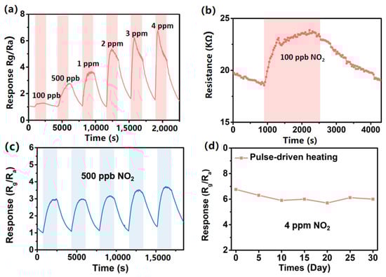 Sensor based on hierarchical In2O3 under pulse-driven heating mode: (a) dynamic response curves of sensor based on hierarchical In2O3 for 0.1–4 ppm NO2; (b) dynamic response curves of sensor based on hierarchical In2O3 for 0.1 ppm NO2; (c) the dynamic response curves of the sensor for 500 ppb NO2 during five cycles; (d) long-term stability.