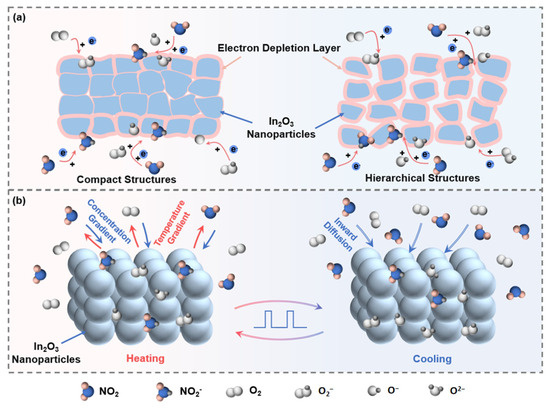 Schematic illustration: (a) sensing mechanism of sensors based on hierarchical In2O3; (b) gas molecular behavior under different stages.
